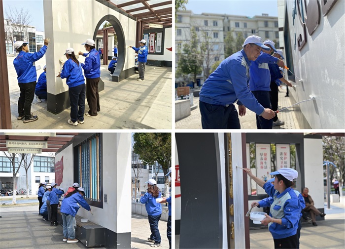 社区长亭、社区服务中心等公共设施的墙面“表皮”脱落,脏污斑驳。志愿者们几人一组,分工协作,为墙面“穿新衣”。他们配合默契,有的拿着铲子,清除杂质;有的手持刷子,粉刷印记......大家齐心协力将墙面刷成整洁明亮的颜色,用辛勤的汗水,让社区环境旧貌换新颜。